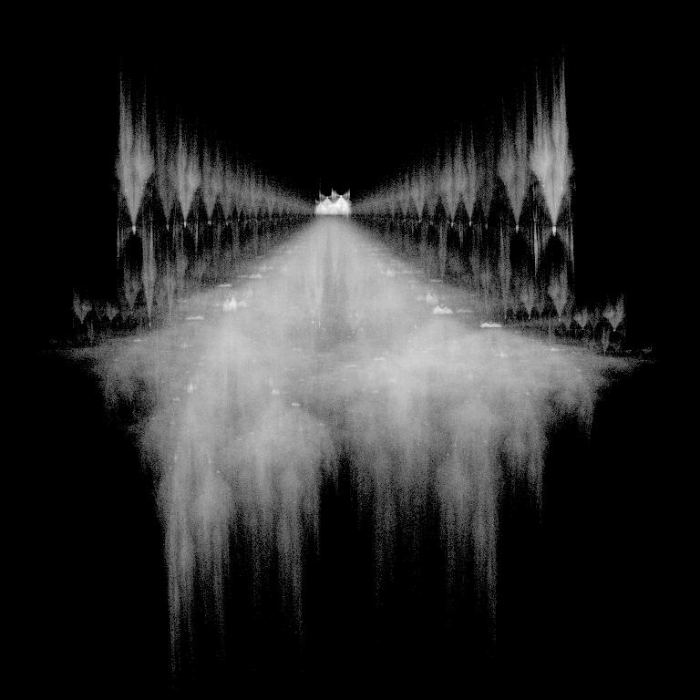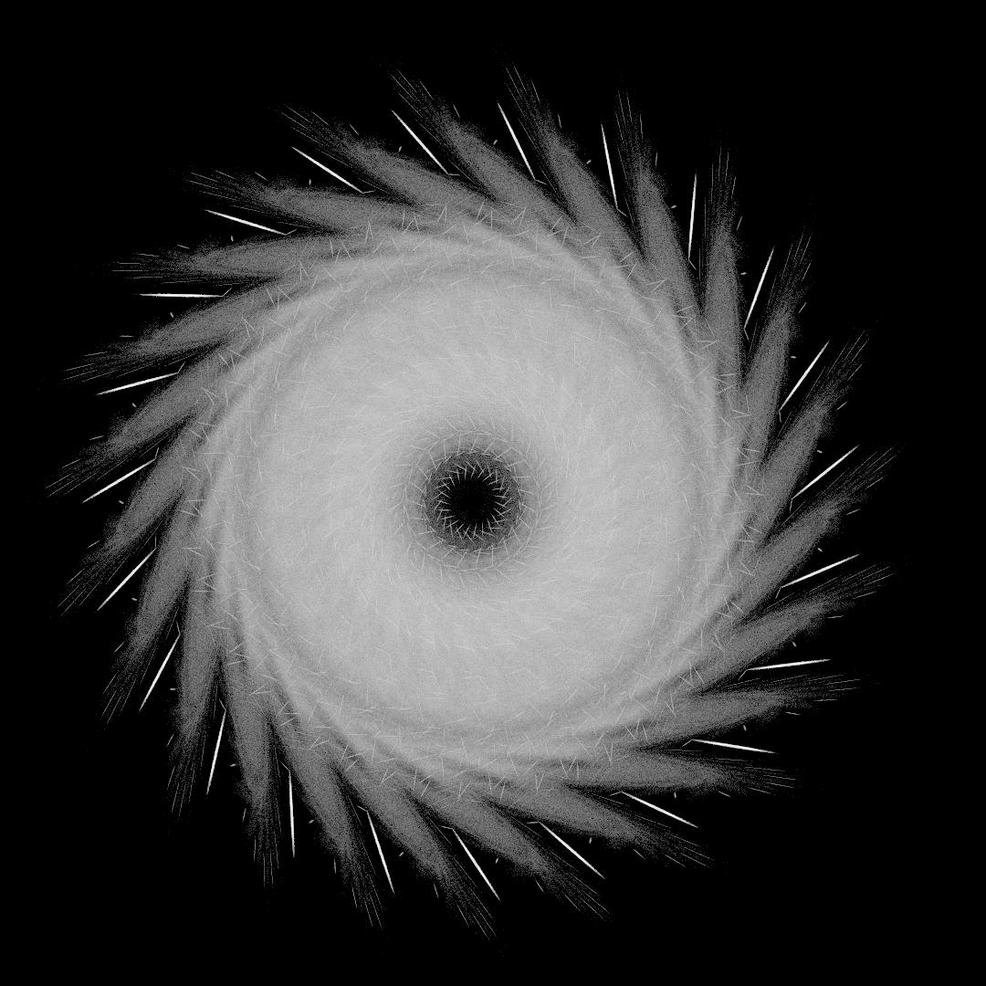Same IFS process but incorporating a simple kaleidoscope function that surprisingly comes up with rather interesting objects like this. Personally, it reminds me of the hand-drawn images I saw as a child illustrating D'Aulaire's