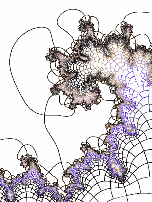 I like how the top left part of this image flows seamlessly into the white border. The squares coloring mode produced the cable-like lines. Of course it took just the right palette to give the depth to the slug-like spiral. The out-coloring was done with binary decomposition using a high bailout of 100 or so. |