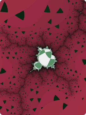 Made with the Mandelbrot formula, this was located in one of the little ravines that run off from the main structure where various reproductions of the distinct mandelbrot "man" are found. Squares on the inside and biomorphs on the outside, which you will quickly come to realize is my favorite setting. The biomorph pattern gives a great appearance of depth without drawing lines. The squares produce a variety of patterns which often have the melted appearance of marble. Sometimes though, they make everything look like a soccer ball. |