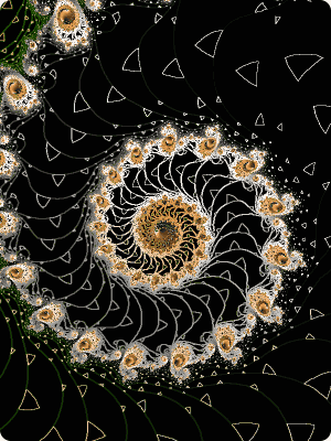 Yet another spiral. But here's an example of spiralistic variety. The triangular biomorphs don't look like stars here but rather more like ice crystals or ice chunks flowing in a chalk board river.